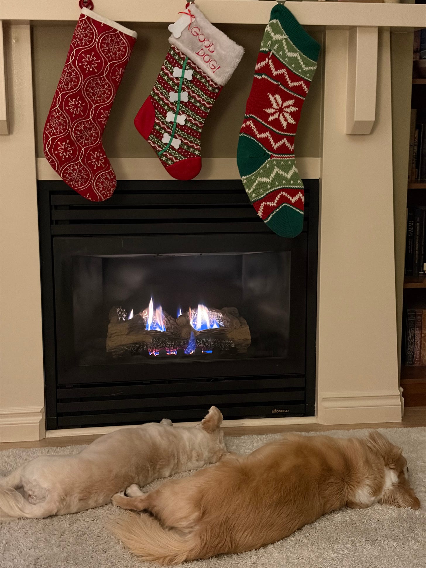 I’ll leave you with this photo of two parallel pups relaxing by the fire. From us to you, have a restful and joyful holiday season…or, at the very least, try and make it through the last days of 2025 in one piece.